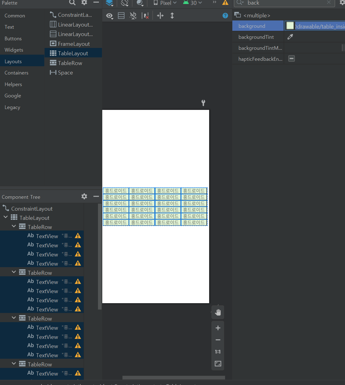 TableLayout, 개별 행(Row), 개별 셀(Cell)의 배경색 지정.