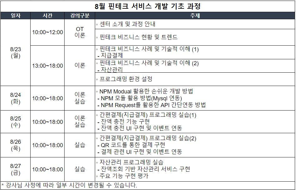 | KISA 핀테크 아카데미 기초반 5일차 1차시 <수업일지> (0) | 2021.08.27 |